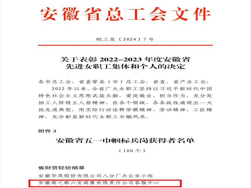 3月11日,安徽省總工會(huì)發(fā)文授予六安商廈客服中心為“2022-2023年度安徽省五一巾幗標(biāo)兵崗”榮譽(yù)稱(chēng)號(hào)。