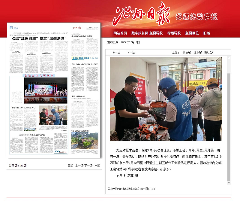 連日來,持續(xù)的高溫,“烤”驗(yàn)著池城的戶外勞動(dòng)者們。池州購物中心積極踐行國有企業(yè)的責(zé)任與擔(dān)當(dāng),7月以來,在工會(huì)驛站開展“送清涼”活動(dòng),陸續(xù)為外賣小哥、環(huán)衛(wèi)工人等戶外勞動(dòng)者送上清涼包、戶外水壺、礦泉水等防暑降溫物品。池州商之都工會(huì)驛站“送清涼”活動(dòng)受到了池州日?qǐng)?bào)的關(guān)注和報(bào)道。