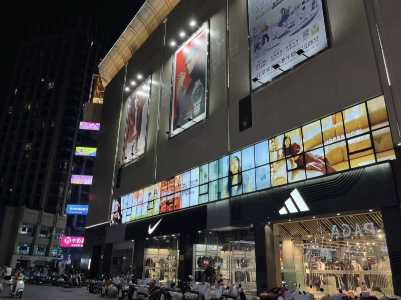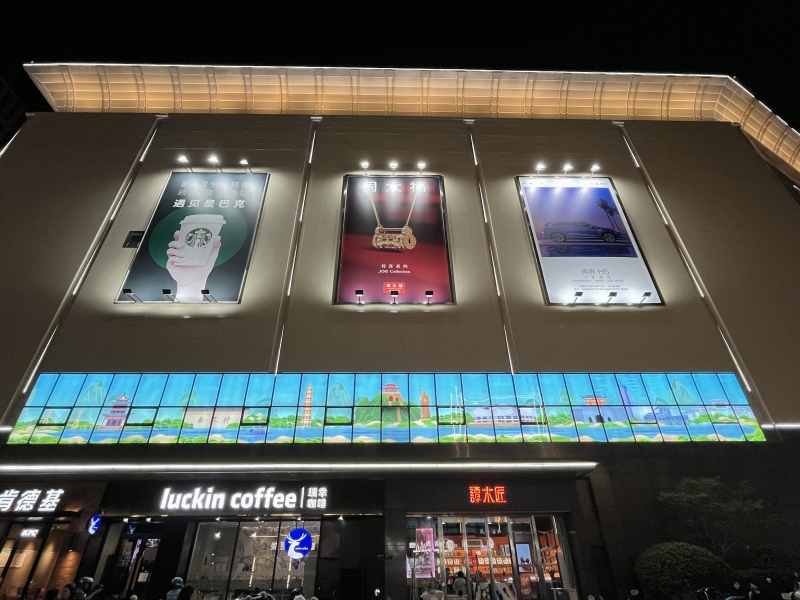 外立面亮化改造工程,對(duì)約7000㎡的外立面進(jìn)行深度清潔與修繕,增設(shè)近景輪廓燈、門頭檐燈等亮化設(shè)施。工程盤活閑置櫥窗改造為主題燈箱-百牙路一側(cè)聚焦品牌展示,烘托購(gòu)物氛圍;長(zhǎng)江路一側(cè)融入九華山、秋浦河、杏花等本土文化元素,讓商業(yè)建筑成為展示窗口。同時(shí),拆除直梯原鋼架廣告牌,更換為逐層展示場(chǎng)內(nèi)品牌的燈箱,兼顧亮化與宣傳功能。目前已完工并進(jìn)入驗(yàn)收階段。