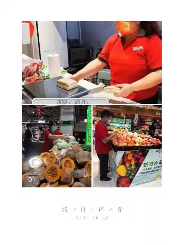 國(guó)慶節(jié)晚上九點(diǎn)半,紅府超市生鮮庫的員工還在忙著分揀、打包。