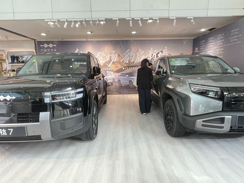 現(xiàn)場(chǎng)展臺(tái)設(shè)計(jì)別具匠心,以大氣的山水景觀為背景,搭配清晰醒目的品牌標(biāo)識(shí),營(yíng)造出雅致且專業(yè)的展示氛圍。本次車站重點(diǎn)呈現(xiàn)了方程豹“豹8”“鈦7”等熱門車型,其中,售價(jià)定格在17.98萬(wàn)-21.98萬(wàn)元區(qū)間的鈦7車型,憑借硬朗大氣的外觀設(shè)計(jì)與明確的越野定位,成功吸引了眾多市民駐足觀賞、咨詢。為提升消費(fèi)者體驗(yàn),展車旁特別設(shè)置了專屬洽談區(qū),便于市民近距離深入了解車型配置詳情及最新購(gòu)車政策。